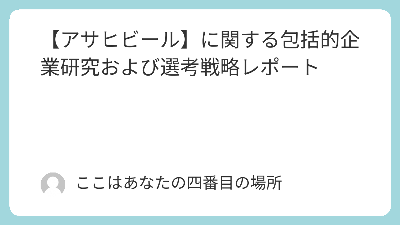 本レポートは、アサヒビール株式会社(以下、アサヒビール)およびその親会社であるアサヒグループホールディングス(以下、アサヒGHD)への入社を志望する就職活動生、とりわけ役員面接(最終選考)等の上位フェーズに臨むハイポテンシャル層を対象とした、包括的かつ深層的な企業分析書である。